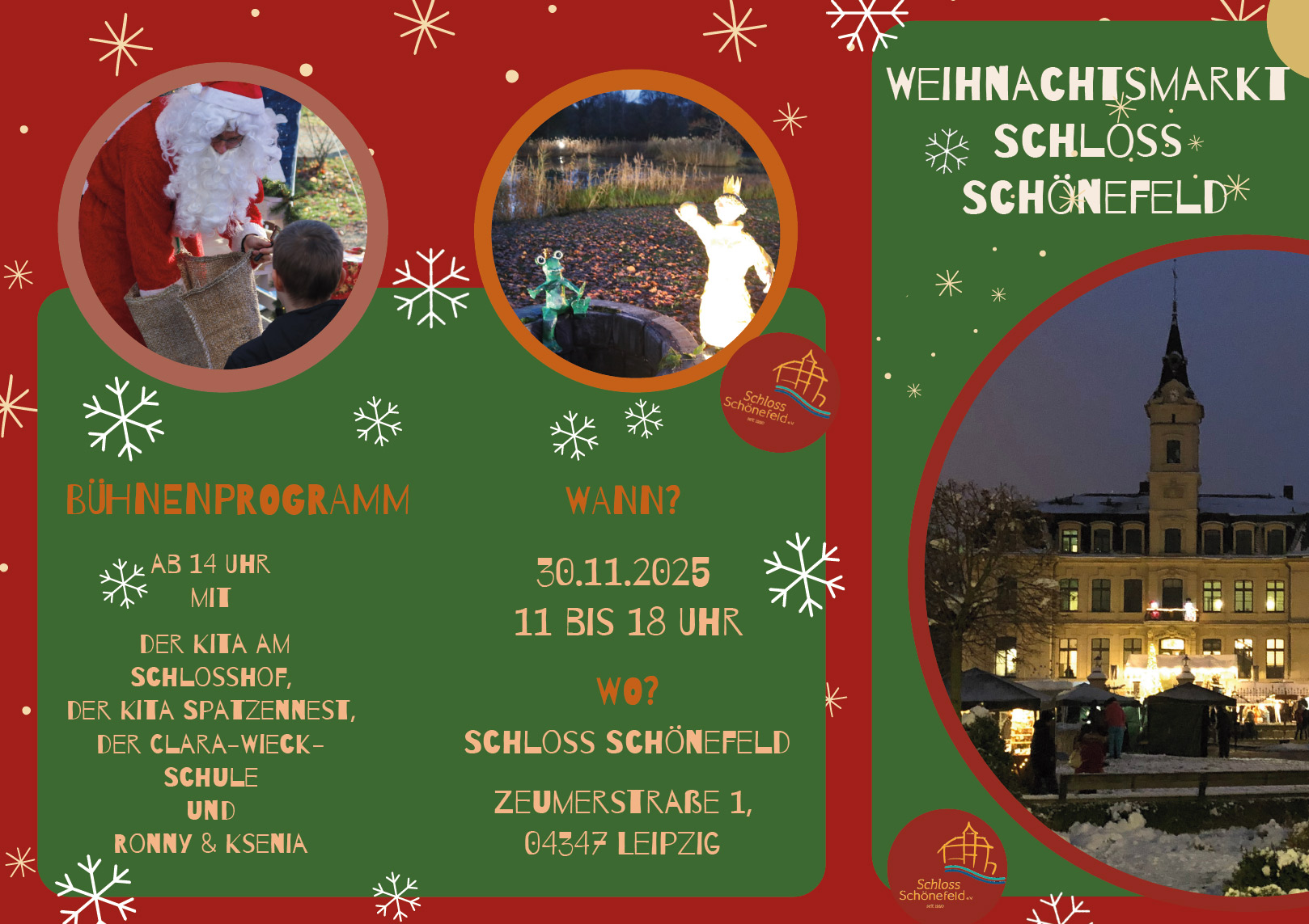 Am ersten Adventssonntag, dem 30. November 2025, lädt der Verein Schloss Schönefeld e.V. Zeumerstraße 1, 04347 Leipzig – von 11 bis 18 Uhr zum traditionellen Weihnachtsmarkt rund um das Schloss ein. Besucher*innen erwartet ein stimmungsvoller Adventstag mit zahlreichen Ständen regionaler Händler*innen, die handgemachte, fair gehandelte und regionale Produkte anbieten.