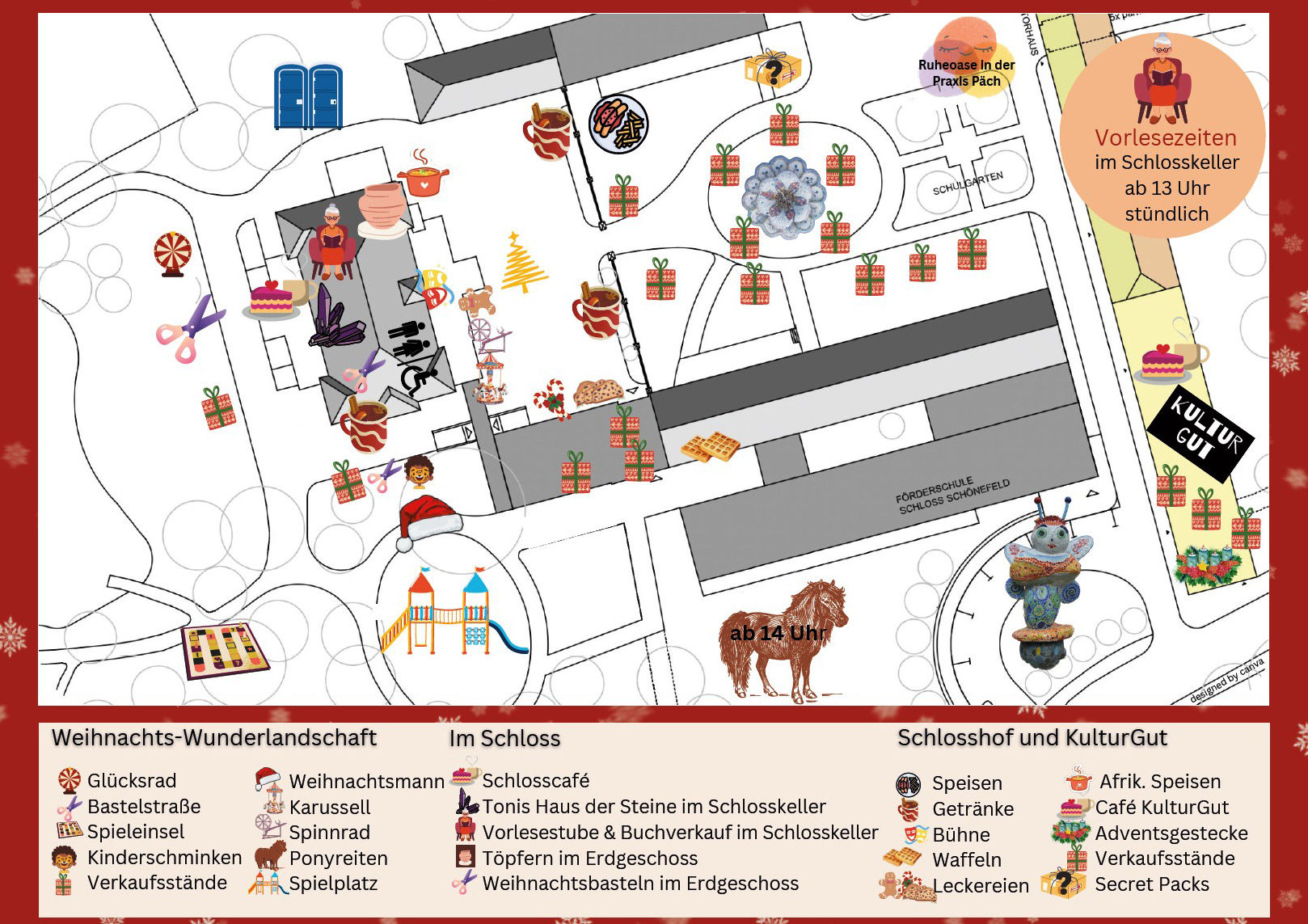 Vor dem Schloss sorgen kulinarische Leckereien, Glühwein und weihnachtliche Musik für eine festliche Atmosphäre. Besonders beliebt ist der Bereich hinter dem Schloss, der sich ganz den Kindern widmet. Dort gibt es Bastel- und Kreativangebote, Ponyreiten und eine Weihnachtsmannsprechstunde. Auch im Schloss werden kreative Mitmachaktionen wie z.B. Töpfern und Steine schleifen sowie eine Märchenstunde angeboten.